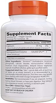 Doctor's Best Serrapeptase - 270 Veggie Caps - eVitamins.com Doctor's Best Serrapeptase is an enzyme with some calcium. Warnings: Keep out of reach of children. Notes: Vegan. Non-GMO. Gluten free. Recommended Use: Take 1 capsule up to 3 times daily without food, or as recommended by a nutritionally-informed physician. Disclaimer: Actual product packaging and materials may contain more and different ...